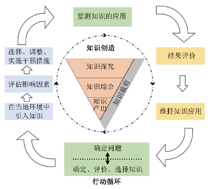 知识创造是指针对目标问题,对相关证据进行识别与评价,加以精炼后提供给利益相关者的过程。该过程如同使用一个知识漏斗,滤取解决目标问题需要的知识(图1),随着知识在漏斗中通过各环节筛选,从漏斗末端流出的知识将作为最有可能惠利于使用者的证据,参与到实施的行动循环当中。