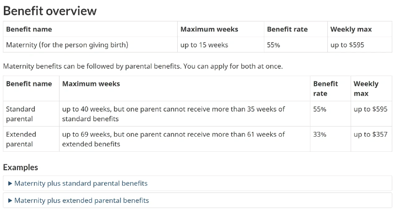 领取产假津贴(Maternity Benefits)的时间窗口,是从预产期前12周到预产期后(或生孩子后)17周之间,最多可领15周,每周最多573加币,也就是上限8595加币。