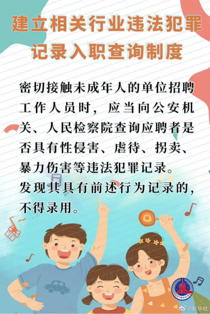 《未成年人保护法》在社会保护中规定了入职查询制度,规定了培训机构、学校等密切接触未成年人的单位禁止招录有性侵害等违法犯罪记录的人员。这是把潜在的“大灰狼”拒之门外,从源头上预防和减少“身边大人”的伤害。