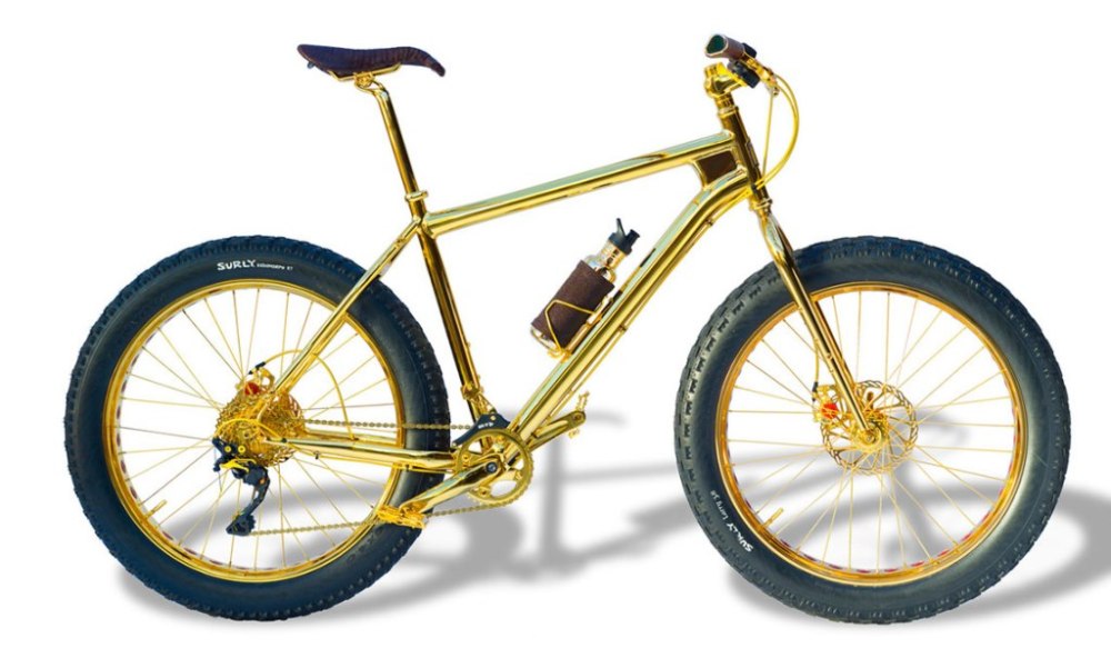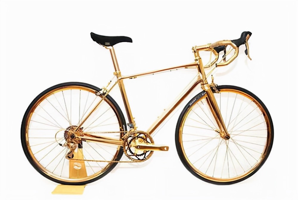这辆自行车由 14 克拉黄金和白金制成,镶有 7 颗 1 克拉钻石,使其成为世界上最昂贵的自行车之一。他们的钻石实际上嵌在自行车车架的辐条上。在车架的前部,还有一块白金和黄金板,为自行车增添了魅力。