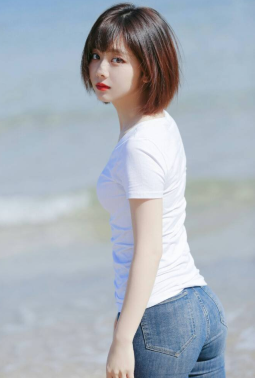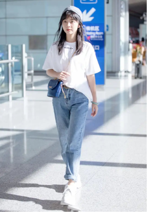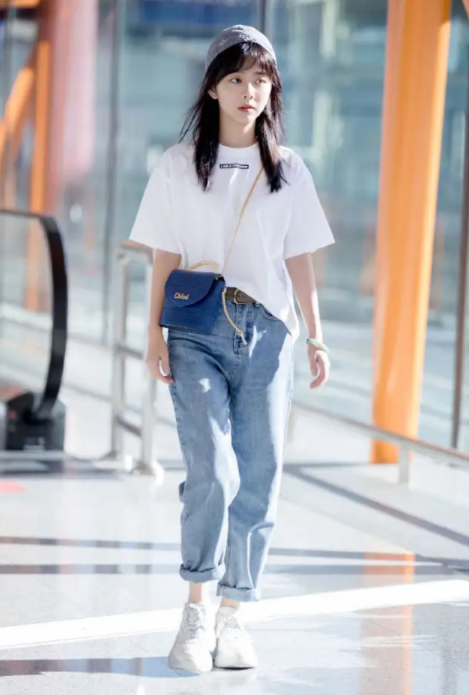 当她穿着一件纯白色的T恤,上面有一小行字母,看上去非常简约大方,下身搭配了一条普通的牛仔裤,时尚又减龄,她一头黑发披肩,反戴着帽子,又显得有一点小俏皮。