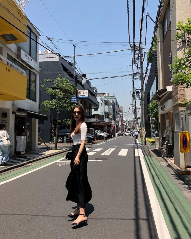 黑色半裙+紧身短Tee还能凸显好身材~