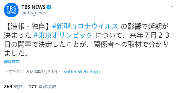 据TBS报道,东京奥运会改期至2021年7月23日开幕,8月24日闭幕。4月3日,国际奥委会在致各国家或地区奥委会的一封信中确认,东京奥运会所有项目的资格赛都需在2021年6月29日前完成。2021年7月5日,即东京奥运会开幕18天前,所有项目将确定东京奥运会的运动员名单。