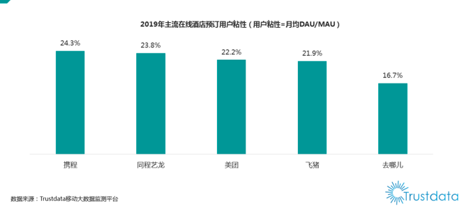Trustdata大数据发布的《2019-2020年中国在线酒店预订行业发展分析报告》显示,2019年中国国内旅游人次首次突破60亿大关,在线酒店预订季度用户平均增速超过25%;在线酒店预订间夜量同比增长26.7%,全年酒店间夜量规模超8亿;三线以下城市的在线酒店预订用户占比增至六成,同比增长54.7%。主流在线酒店预订用户粘性较为接近,携程、同程艺龙及美团酒店排名TOP 3。
