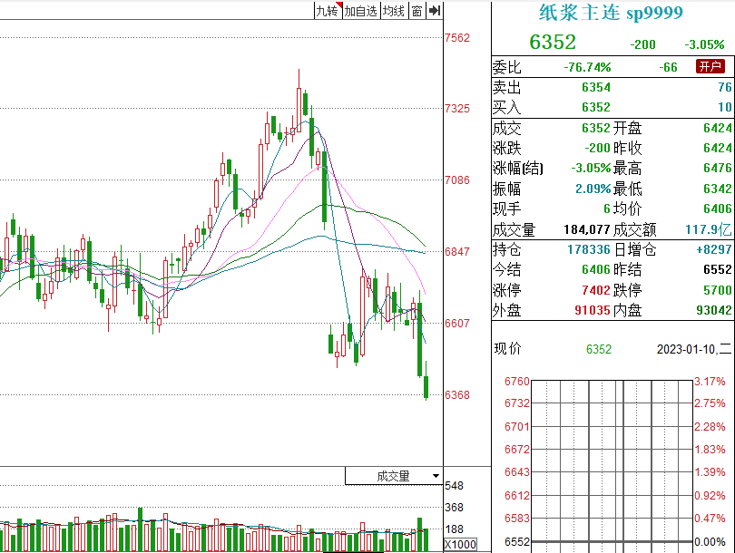 1月10日,截至15:00,纸浆主连下跌3.05%,交易量117.9亿,最新价格6352。