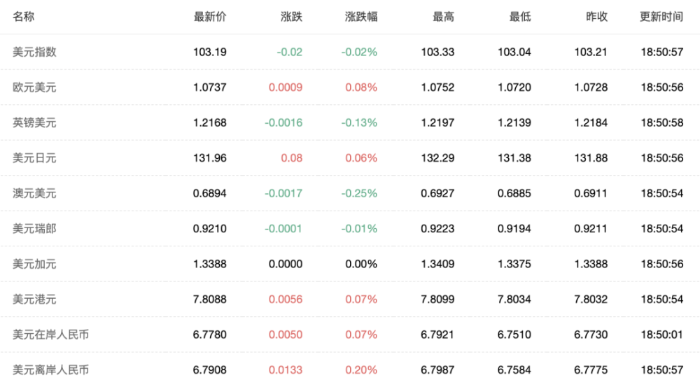截至1月10日18:50,美元指数下跌0.02%,报103.19;欧元上涨0.08%,报1.0737;英镑下跌0.13%,报1.2168。