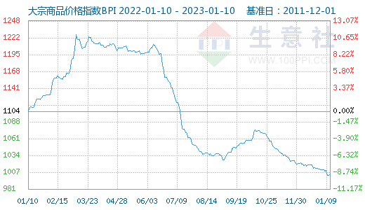 1月10日大宗商品价格指数BPI为1005点,与昨日持平,较周期内最高点1343点(2021-10-19)下降了25.17%,较2016年02月03日最低点660点上涨了52.27%。(注:周期指2011-12-01至今)
