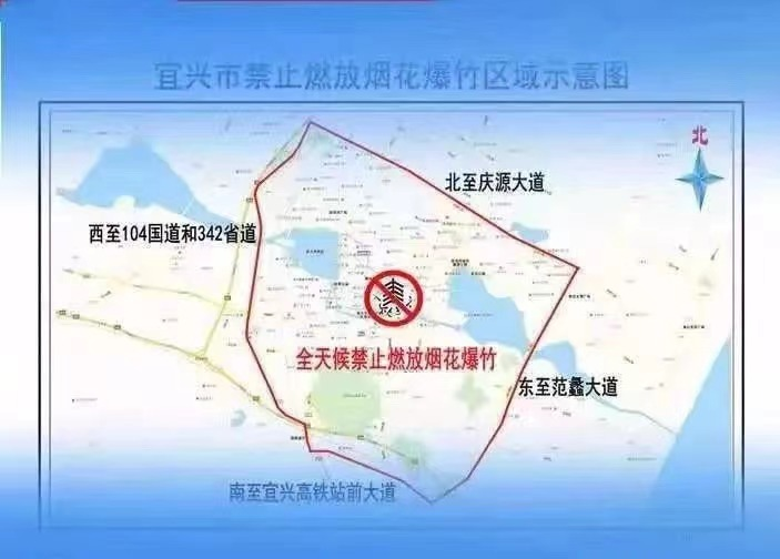 根据《宜兴市禁止燃放烟花爆竹实施办法》规定,宜兴市烟花爆竹的禁放区域为:东至范蠡大道、南至宜兴高铁站前大道、西至104国道和342省道、北至庆源大道。