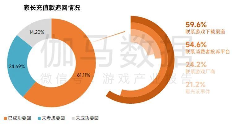 在游戏防沉迷限制下,近三成未成年人游戏相关消费减少。2022年出现未成年人私自充值现象的家庭占比降至15.43%,较2021年有了明显下降。对于已充值钱款,家长主要通过联系游戏下载渠道或联系投诉平台以追回,但仍有部分家长未能要回充值款,未来应加强家长退款渠道建设,保障用户合法权益。
