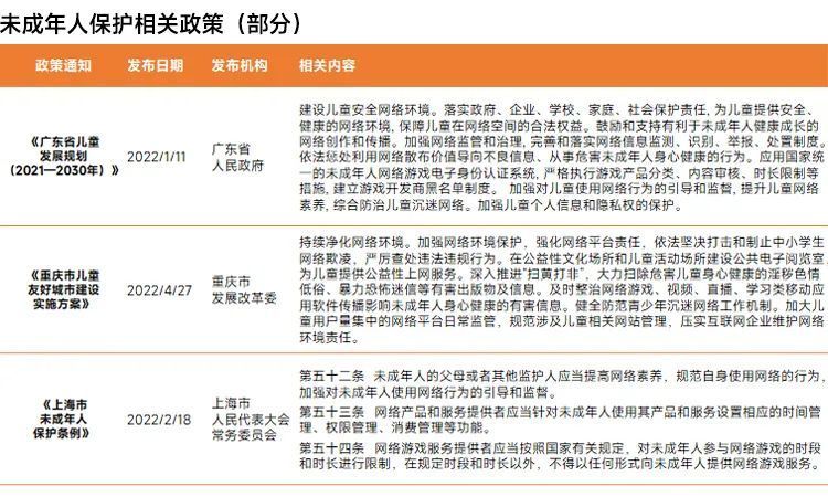 随着未成年人保护工作的推进,各地政府与相关部门也陆续出台相关政策,对未成年人保护后续工作提出指导意见。截至2022年9月,我国各地区共推出七十余条涉及未成年人保护的相关政策,除了对落实游戏防沉迷体系这一基本要求进行强调,多地政策还对用户信息保护、产品内容审核、功能性游戏开发等方面提出了相应要求。在未成年人保护工作过程中,实名认证、人脸识别、用户行为分析等多个环节涉及到用户个人信息采集,各地政策对个人信息的关注,指明了游戏企业后续工作的重点,在做好未成年人保护的同时,也要特别加强对个人信息安全的保障。
