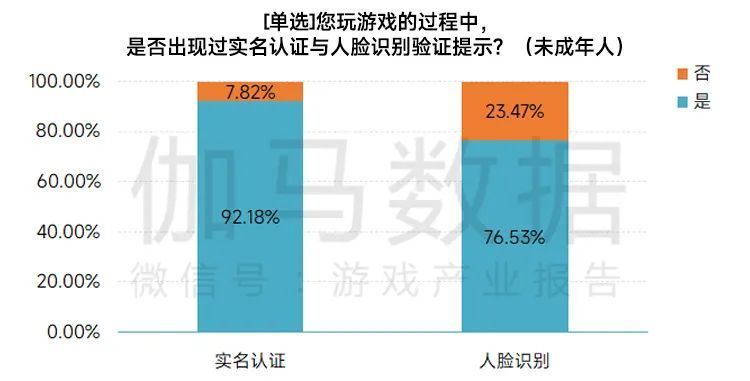 从用户端来看,有超过九成未成年人在游戏过程中被要求进行实名认证。作为提升游戏防沉迷效果的重要环节,人脸识别遏制了未成年人冒用身份信息的行为,提高了基于实名认证的防沉迷体系的有效性。根据用户调研,超过76%的未成年游戏用户遇到过人脸识别验证,当前用户行为分析与人脸识别功能的运用已取得切实成效,随着更多的游戏接入人脸识别,冒用身份现象将得到进一步改善。
