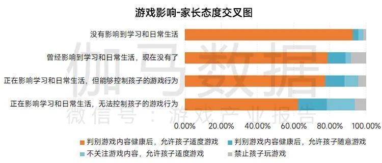 家长对孩子游戏行为的态度与游戏对孩子生活的影响存在相关性,一方面,当游戏未对孩子日常生活产生不良影响时,家长对孩子的游戏行为表现出较高接受度;另一方面,随着家长对孩子游戏行为监管力度的下降,孩子出现过度游戏以影响日常生活的概率也出现明显提升。在允许孩子适度游戏的家庭中,部分家长会允许孩子在自身监管下进行健康游戏,但从结果上看,在监管力度不足的时段,未成年人仍会进行监管外的游戏行为。值得注意的是,对于摆脱了游戏不良影响的未成年人,其家长对于游戏的态度更趋严格,不关注游戏内容便允许孩子进行游戏的情况极少出现。