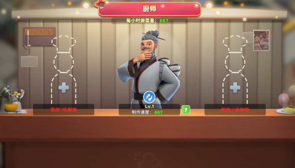 当玩家准备营业时,需要在厨房配置厨师和菜单,前者影响菜品种类和出餐的速度,后者则对应着收入和客流量。