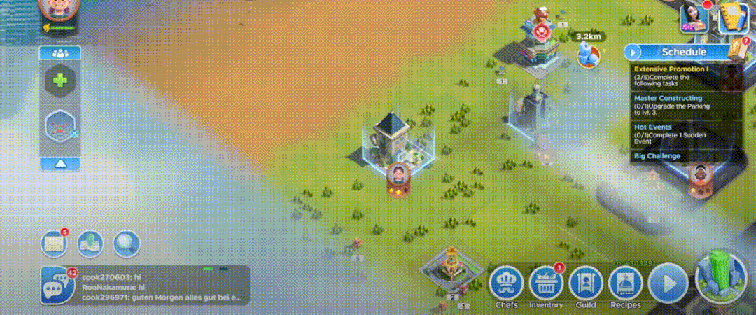 当然,除了城建玩法以外,游戏将餐厅要素也融入到了SLG的大地图对抗玩法上。不过,由于并非是传统的战争题材,因此他们在前期是有选择性地去淡化,SLG中的对抗、征服、竞争等严肃硬核的元素,反而更多地去让玩家感受餐厅发展、实力扩张的乐趣。