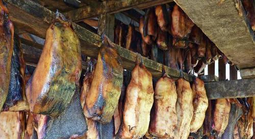 没错,这道菜就是用鲨鱼制作而成的,因为鲨鱼肉里面是含有一定毒素的,冰岛人捕获鲨鱼之后没办法直接食用,于是就将鲨鱼肉切成大块,埋在一些冻土里面,让它自己发酵分解毒素。经过几个月时间的发酵之后,毒素完全分解,而鲨鱼肉也完全发酵,取出来之后再风干,而整个风干过程,那股刺鼻的酸臭味经久不散,毕飞宇罐头还恐怖,简直辣眼睛。