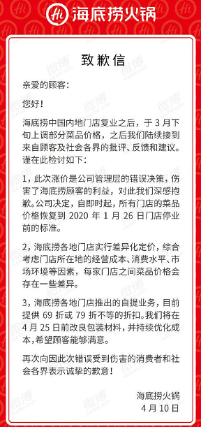 4月10日,海底捞火锅就涨价问题公开发表致歉信,并声明此前全国门店涨价为公司管理层的错误决策,伤害了顾客的利益,对此深感抱歉。据悉,自即日起,国内所有海底捞门店菜品价格将恢复到今年1月26日门店停业标准。在致歉信发出后,记者致电济南海底捞泉城路店。据店员介绍,其门店菜品价格已全部恢复原价。(山东商报·速豹新闻记者 丁一凡)