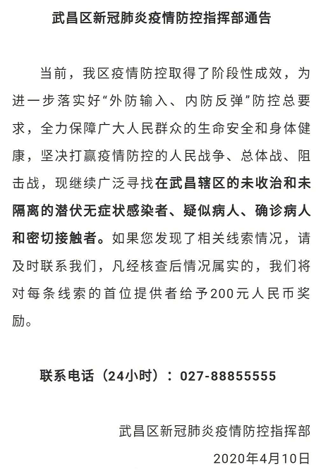 10日,武汉市武昌区融媒体中心消息称,武汉武昌区新冠肺炎疫情防控指挥部发布通告,继续广泛寻找在武昌辖区的未收治和未隔离的潜伏无症状感染者、疑似病人、确诊病人和密切接触者。凡是举报后核查属实的,将对每条线索的首位举报者给予200元人民币奖励。(中国新闻网)