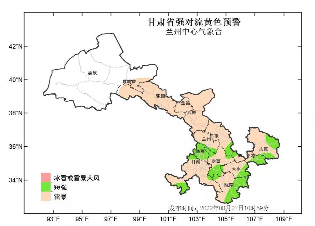 央广网兰州8月27日消息(见习记者 李红军)8月27日10时59分,兰州中心气象台发布甘肃省强对流黄色预警:预计未来24小时,甘肃省张掖以东大部分地方将有雷暴,其中,27日14时-23时,白银、兰州、定西、临夏、甘南等市州局部地方有短时强降水,最大小时降水量20-40毫米;27日17时-28日08时,陇南、天水、平凉、庆阳等市部分地方及定西市东南部有短时强降水,最大小时降水量30-50毫米,局地可达60毫米以上。