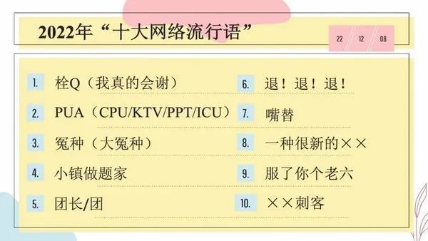 近日,由教育部语言文字应用管理司、语言文字信息管理司指导的上海《语言文字周报》公布了2022年“十大网络流行语”,“栓Q(我真的会谢)”“PUA(CPU/KTV/PPT/ICU)”“冤种(大冤种)”“小镇做题家”“团长/团”“退!退!退!”“嘴替”“一种很新的XX”“服了你个老六”“XX刺客”上榜。而“冰墩墩(冬奥会)”“二十大”“中国式现代化”“人民至上,生命至上”“做核酸”“俄乌冲突”“刘畊宏女孩/王心凌男孩”“数字经济”“网课”“卡塔尔世界杯”等入选2022年“十大网络热议语”。