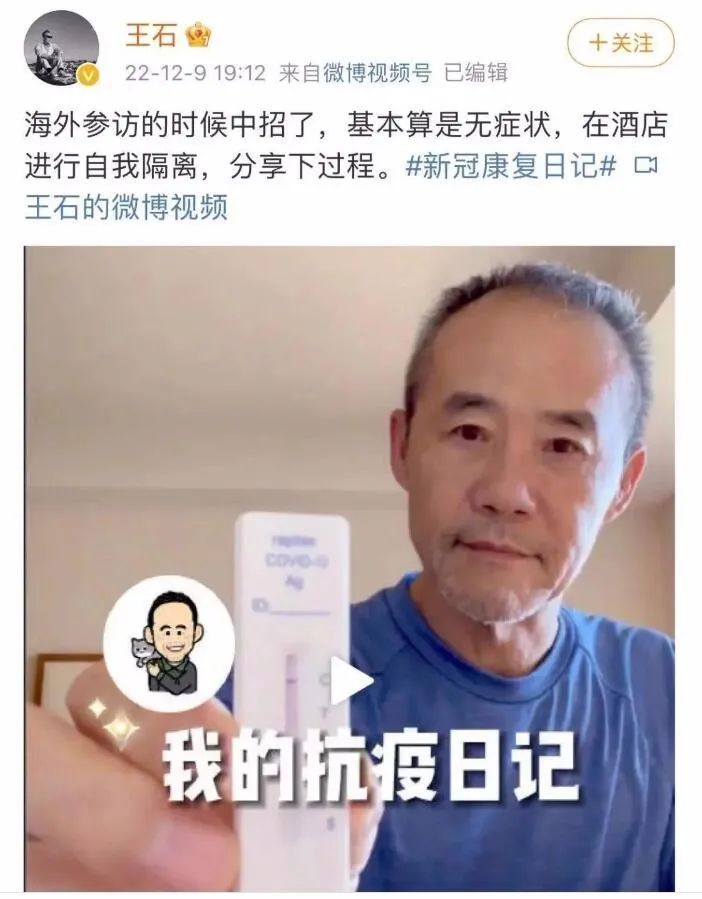 12月9日,万科集团创始人兼董事会名誉主席王石在微博发布视频表示,他在海外参访的时候感染了新冠病毒,并分享了感染新冠后隔离的全过程。视频中,王石从抗原检测阳性到转为阴性整个过程经历了10天。