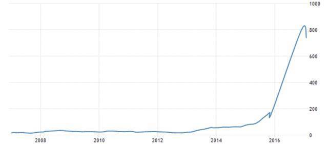 近10年来委内瑞拉通货膨胀率(来源:TRADING ECONOMICS)