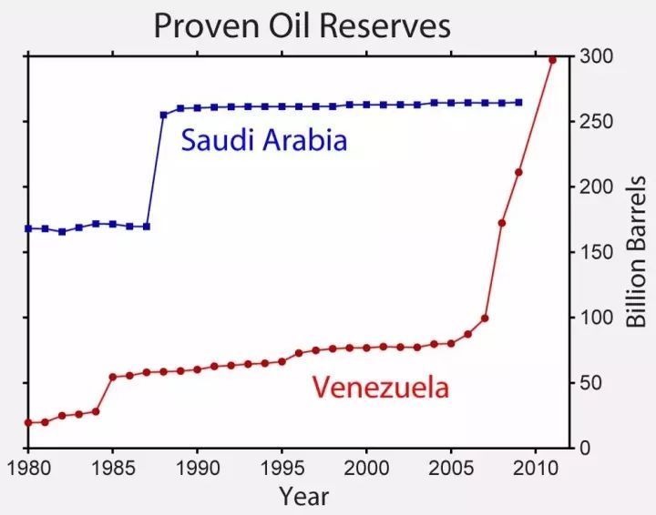 委内瑞拉(红线)与沙特原油储量比较(来源:Wikipedia)