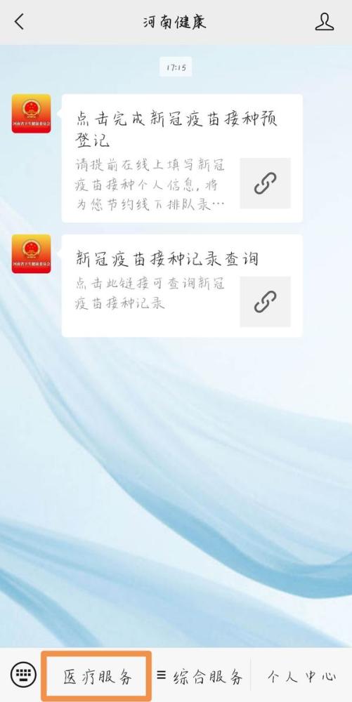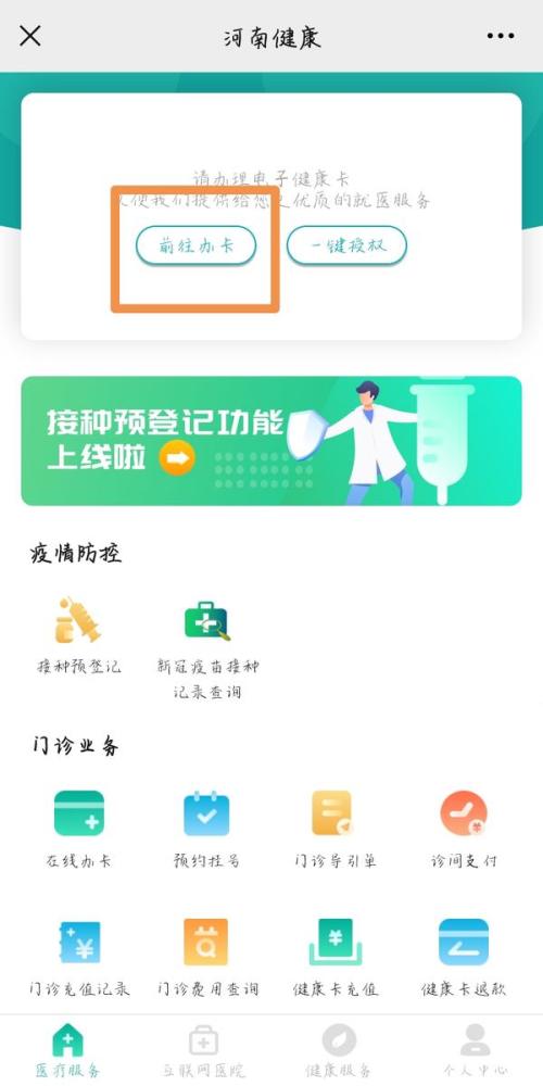 据了解,获取健康码需先关注“河南健康”微信公众号,在对话界面,点击左下角“医疗服务”一栏,而后点击前往办卡。