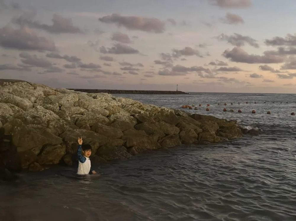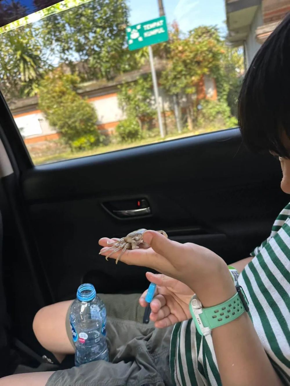 第一天他在海边捉了几只寄居蟹,还算小打小闹。第二天渐入佳境,开始捉回小孩巴掌大的螃蟹。等到要离开酒店前一晚,他顶着晒脱皮的鼻子回来,一脸幸福满足举起袋子,告诉我,晚上可以加餐了。