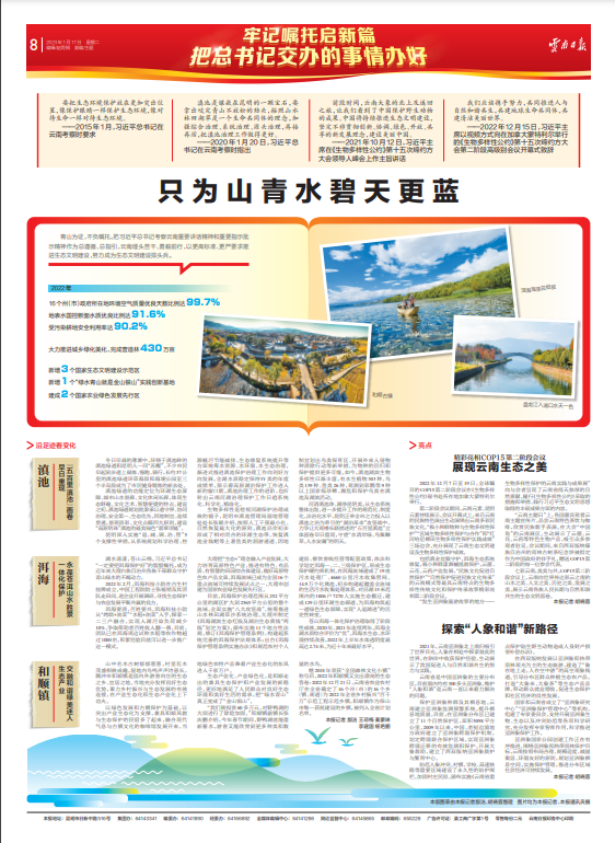 数据显示,2022年全省空气质量持续保持领先,九大高原湖泊水质总体向优向好。16个州(市)政府所在地环境空气质量优良天数比例达99.7%,居全国第一位。云南森林覆盖率稳居全国前列。