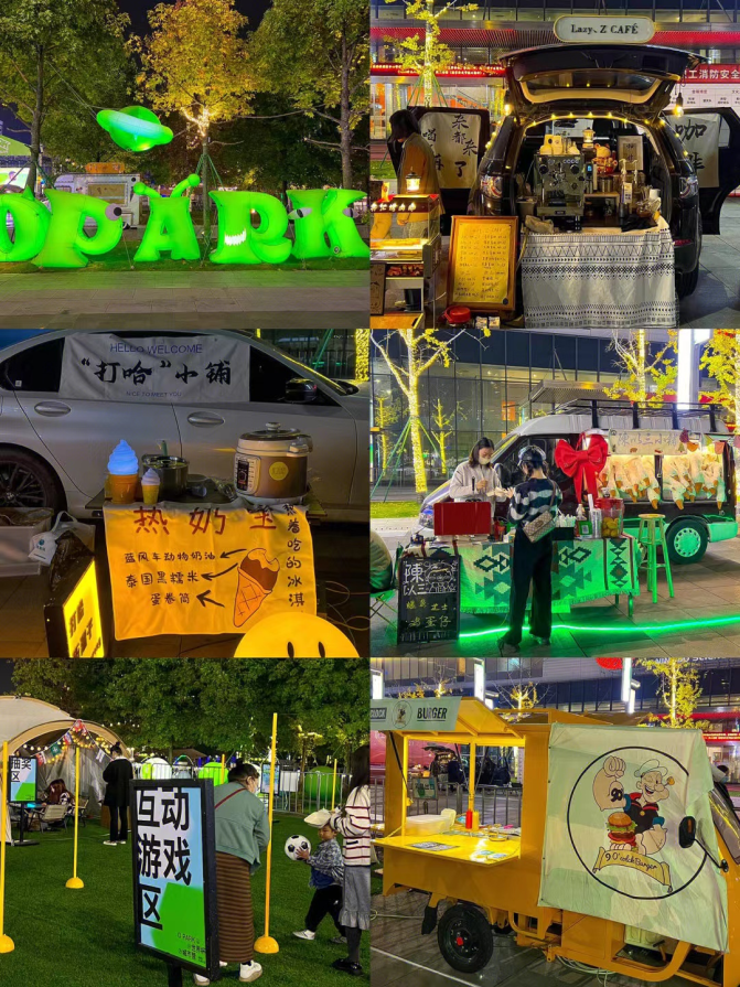 周边对商户提供各种移动摊位和露营摊位,并统一管理,每周还会更新美食品类,“钓”足了消费者的口味。