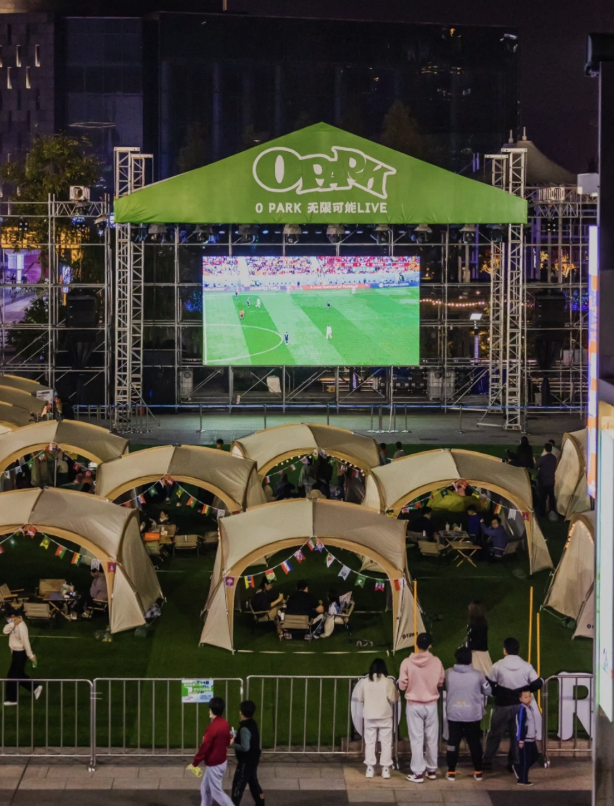 近几年从小红书爆火的“户外露营”,与世界杯相结合后,再次“踢热全场”,全国各大商业综合体紧扣球迷“聚众观赛”的需求,纷纷晒出“城市营地”,解锁“世界杯主题营地”的夜间新模式,为自身创造热度,提升夜间经营能力。