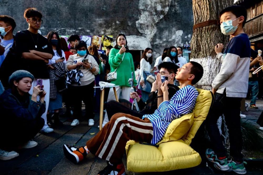 沙发主人叫冯小岗,26岁,是个短视频博主,在这个鼓励开放交流的沙发实验上,我们的周围很快围满了年轻人。11月底的乌镇戏剧节满是好奇的大学生和刚进职场的青年,每送走一个从害怕、紧张到感觉激动的路人,下一个就急忙坐了上来。