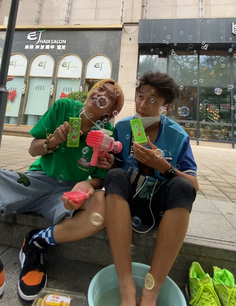 我们最后一次聊天时,小岗刚刚结束他的“街头工作”,他兴高采烈地告诉我,他刚刚又成功逗笑了一个工地工人。刚开始大哥一直回避小岗的目光,还把安全帽的帽檐压得特别低,于是小岗开始问他,过年给不给财神爷磕头,接着突然跪下,给他磕了个响头,大哥噗嗤一声笑出来,最后他们还交换了彼此的帽子。