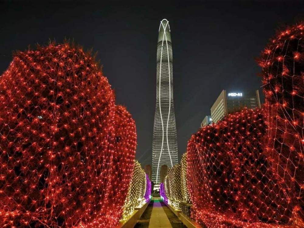 天津周大福金融中心夜景灯饰采用了“匠心筑城”的理念,塔楼外形设计灵感来源于流体几何,锥形设计造型直插云霄。塔楼幕墙里面镶嵌了3万多个LED,可以在夜晚产生动态模式、横向波浪、竖向波浪、闪烁效果、倒数等不同的灯光效果。
