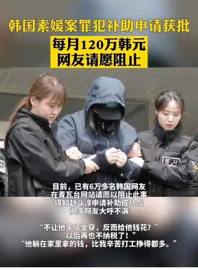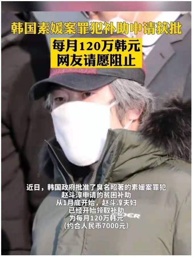 日前,韩国电影《素媛》原型罪犯赵斗淳向居住地所在政府,提交韩国向低收入群体发放的国民基础生活保障补贴申请,引发民众强烈反对。当地时间2月2日,京畿安山地区相关人士透露,安山市在1月末审查通过了赵斗淳夫妇的基础生活保障领取资格。由此,赵斗淳夫妇每月可领取120万韩元(约合人民币近7000元)左右的补贴。目前,青瓦台国民请愿网站上关于“不要给赵斗淳基础生活补助金”的帖子已有6万余人支持。