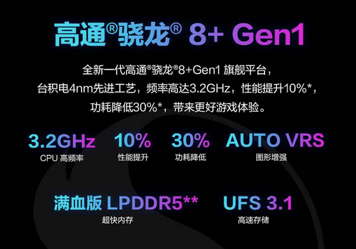 性能一向是游戏手机的绝对核心,ROG对此交出了一份高分答卷。采用高通骁龙8+ Gen1 5G移动平台,升级为台积电4nm工艺,相较于上一代骁龙8 Gen1,总体性能提升10%,功耗降低30%,提升游戏帧数并改善续航表现。存储方面至高采用16GB LPDDR5运行内存,512GB UFS 3.1高速存储,先人一步抵达战场,享受霸榜积分榜天梯的乐趣。