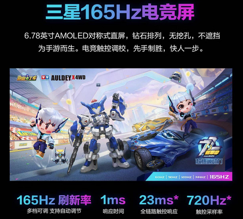 屏幕方面,ROG游戏手机6选用三星165Hz电竞屏,其采用无挖孔全面怕设计,拥有多档可调刷新率,可根据需求自由切换。1ms疾速屏幕响应延时、23ms全链路触控响应和720Hz触控采样率结合,展现灵敏操作,游戏操作更跟手。在《王牌战士》《穿越火线手游》《金铲铲之战》中可开启高帧率模式,借助硬件优势在对战中先发制人,奠定胜局。色彩表现上,这块屏幕的素质也令人亮眼,DCI-P3色域覆盖率高达111%,Delta-E<1,表现比肩专业显示器,使游戏中暗部的敌人也清晰可见,无所遁形,亦可在B站等视频平台内观看HDR视频,享受视觉盛宴。