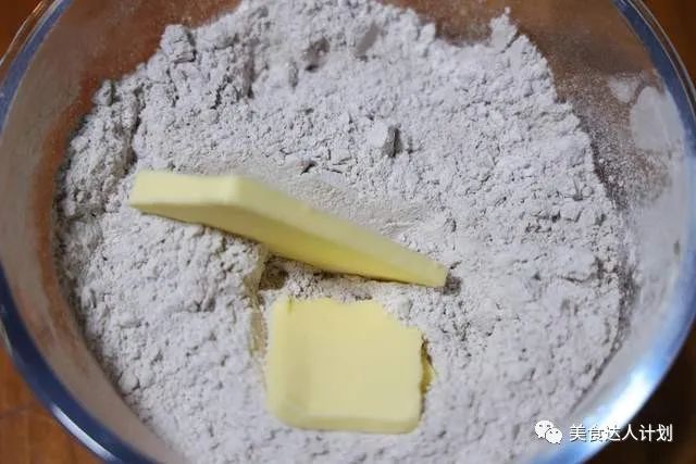 2、把粉类过筛到碗中,最后加入白糖拌均匀,再把黄油加进去;