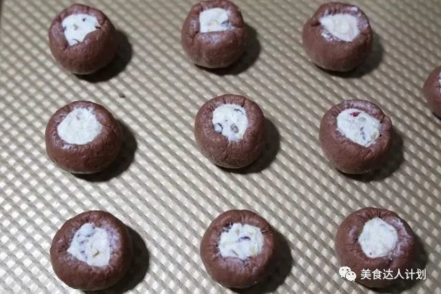 1、先把奶油奶酪加入白糖、蔓越莓干,黑巧克力拌均匀,装在裱花袋里备用;