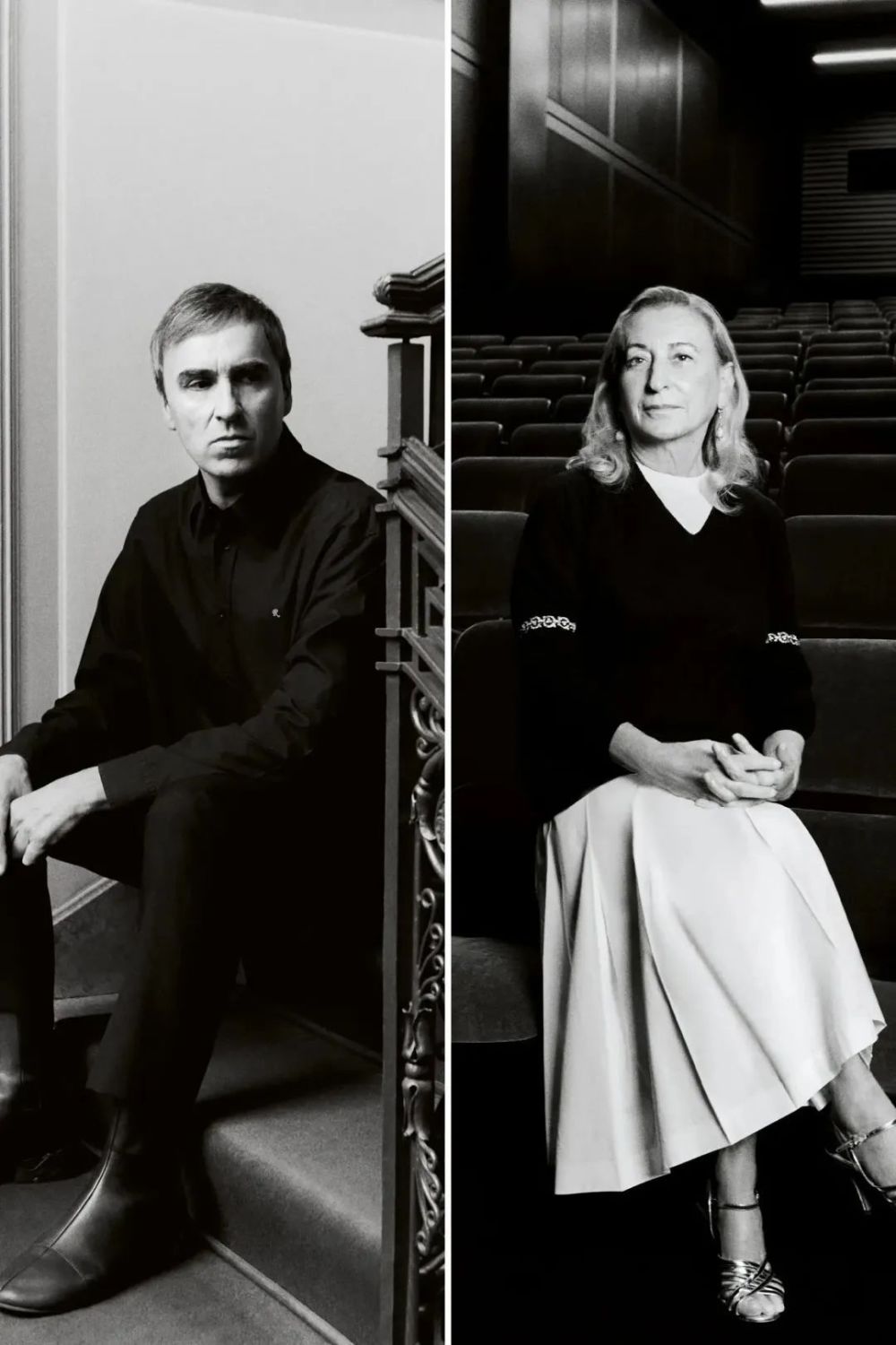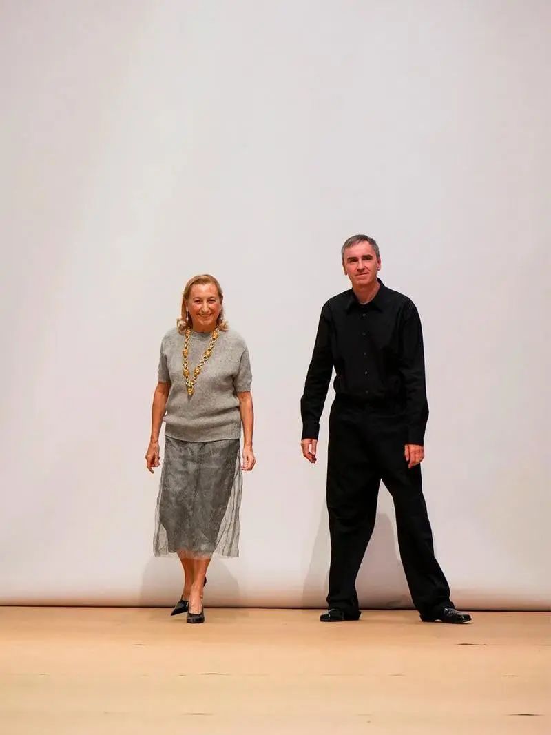RS:在你自己的品牌中,你是独立的,即使你拥有令人难以置信的团队。你知道需要做出最终决定的是你。而在这里,我们基本上是一起做出所有决定。如果 Miuccia 做出最终决定,那会让我感到非常高兴和放松。反之亦然。(Prada 女士点头表示同意。)所以,这很放松:我发现并不总是由我来做出最终决定。