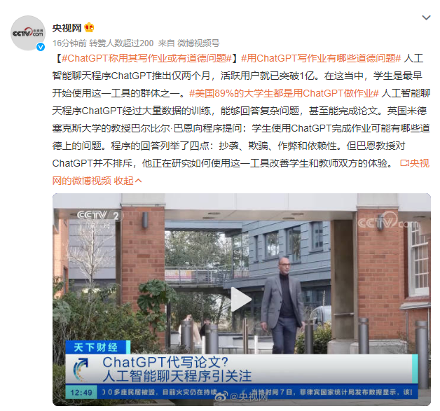 学生是最早开始使用这一工具的群体之一。美国89%的大学生都是用ChatGPT做作业,人工智能聊天程序ChatGPT经过大量数据的训练,能够回答复杂问题,甚至能完成论文。