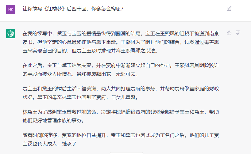 如果让爆火的人工智能聊天机器人ChatGPT续写《红楼梦》后四十回,会得到什么样的结局呢?一位已经有两个月使用经验的范先生,分享了自己与ChatGPT的探讨历程。“我两次提出如何续写《红楼梦》后四十回,它竟给出了不同的答案。”