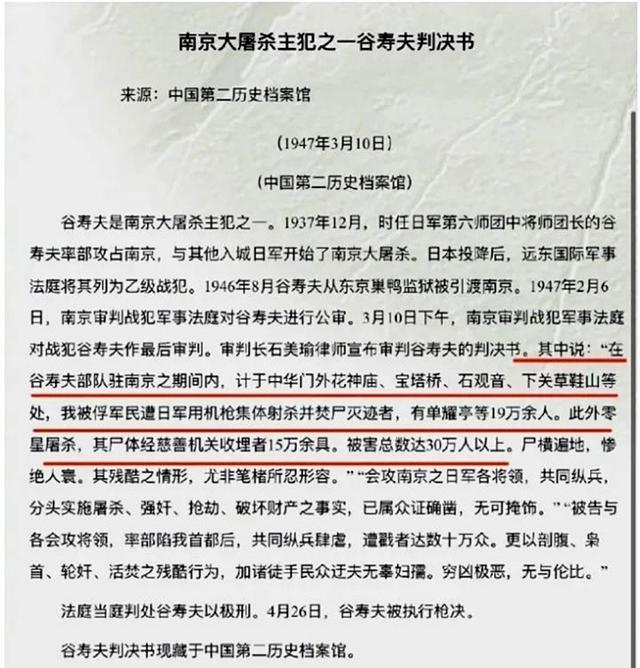 “在谷寿夫部队驻南京之期间内……我被俘军民遭日军用机枪集体射杀并焚尸灭迹者,有单耀亭等19万余人。此外零星屠杀,其尸体经慈善机关收埋者15万余具,被害总数达30万人以上。”