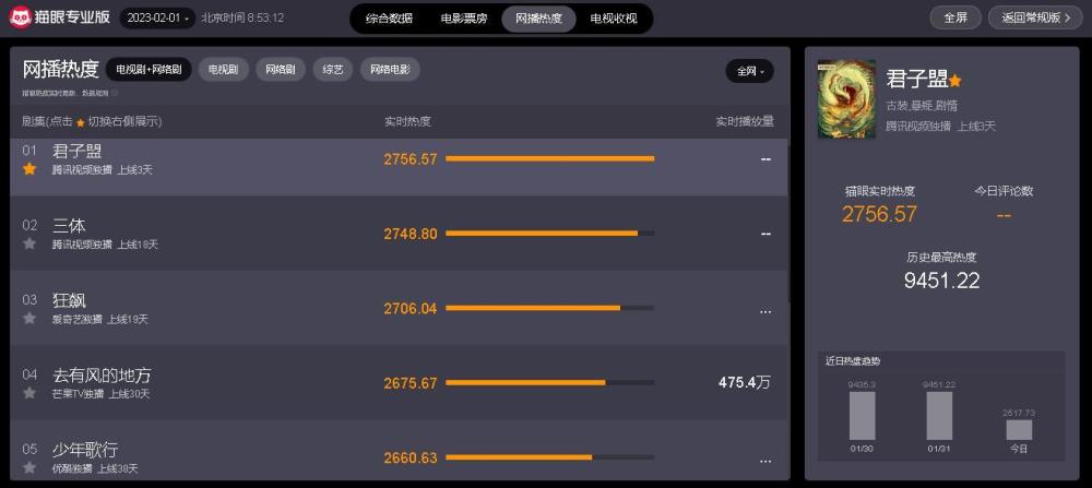 截止发文时间,从“猫眼专业版”实时数据显示可知,当前热播电视剧中,网播热度排行榜前五分别如下: