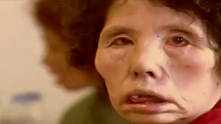 其中年龄最大的51岁,名叫原桂芝,由于严重毁容,她无法正常活动,经常蹲下或挪动身体。