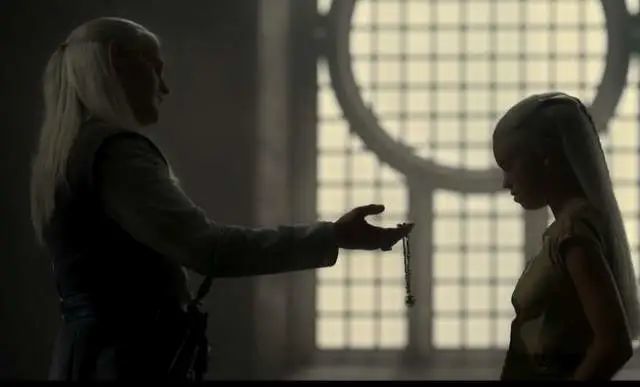 在第1集里,韦赛里斯登上王位后,他也面临选择继承人的问题。最终,在弟弟戴蒙和女儿雷妮拉之间,他选择了雷妮拉。