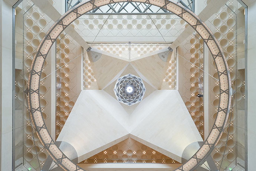 博物馆内部大厅正上方犹如多切割面几何形的穹顶一顶为圣殿加冕的皇冠,恢弘大气又神圣,设计用现代方式解构了经典伊斯兰建筑,通过简洁优雅的排列,营造出肃穆神秘的氛围。