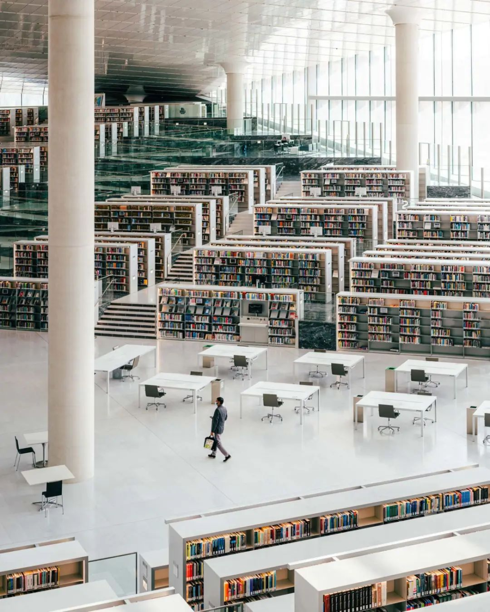 图书馆建筑的边缘仿佛从地面上升起,形成了三条过道,可容纳藏书。同时被包围着的中心三角形空间过道中间穿插着阅读、社交和浏览空间。而书架也是这座建筑的一部分,用与地板相同的白色大理石制成,以达成氛围的统一。
