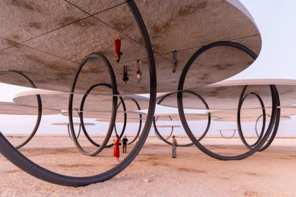 装置用钢和玻璃纤维制成圆形和半圆形的支撑件,圆形平台下搭载着镜面,互相连接的天花板映照着沙漠景观,构成元素与游客之间互动,这件艺术作品旨在让参观者更敏锐地察觉到身边环境的美与复杂性,进而提升人们对气候危机的认识。