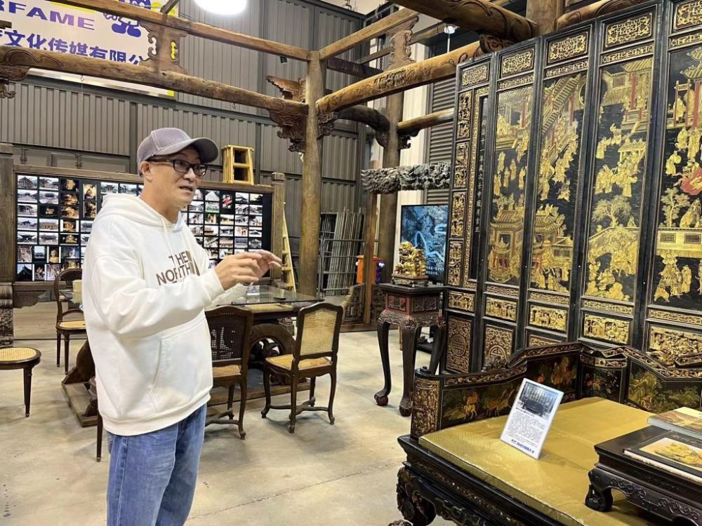 眼前的钟剑伟先生,体格清瘦、目光炯炯,他向记者介绍起这些古董的由来,“金漆木雕屏风和罗汉床距今有151年的历史,是我20年前在广州那边购买收藏的,这是当时潮州大家族的贺寿屏,家族长辈寿宴就把它立起来,罗汉床也是配套的,老太太坐在中间接受子孙们的祝福。”